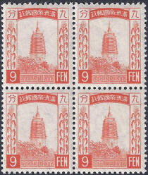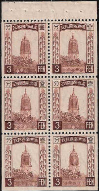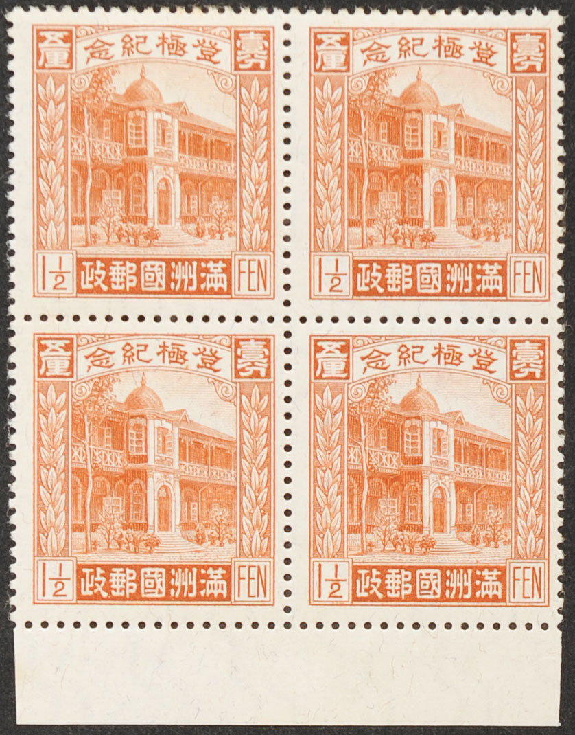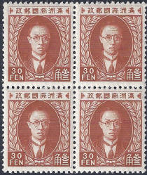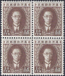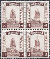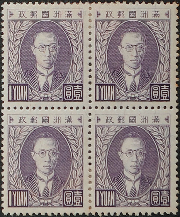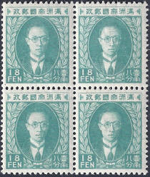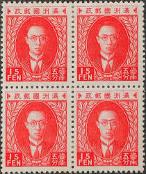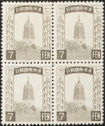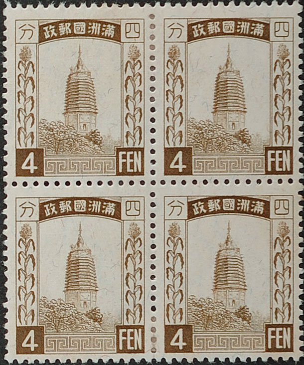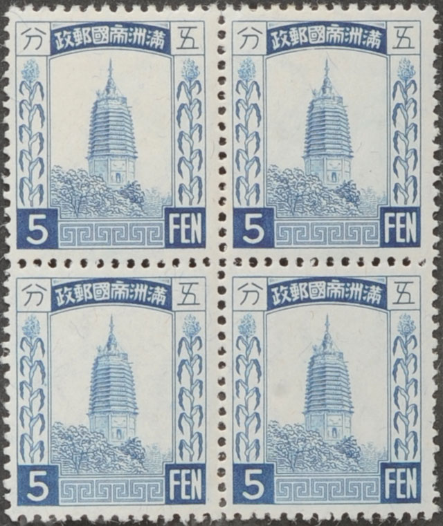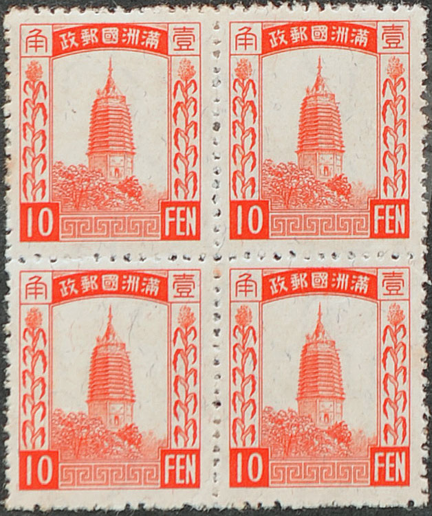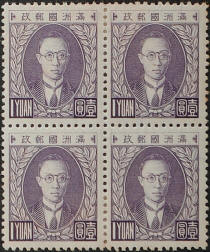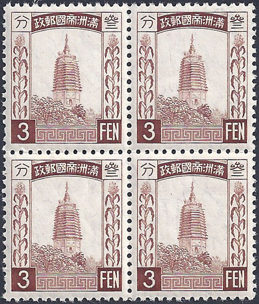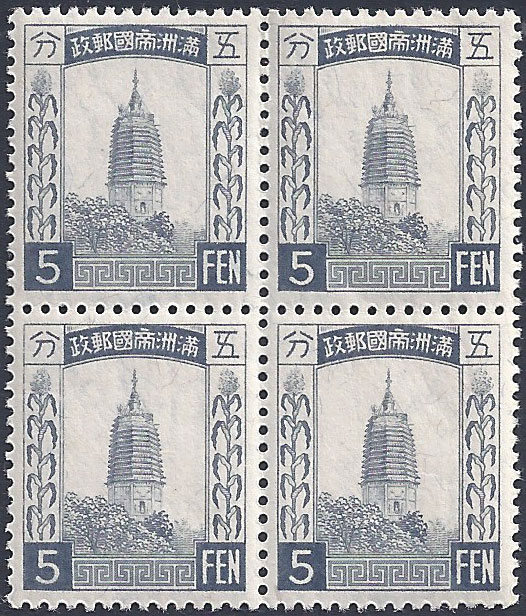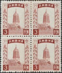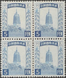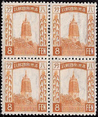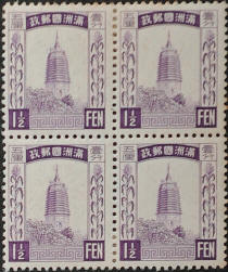 The ½fen to 10fen depict the White Pagoda at Liaoyang with a 15f and 1Yuan showing Puyi, later to become Emperor Kang-teh. Note that this issue has five characters in the top banner reading "Manchu State Postal Administration"