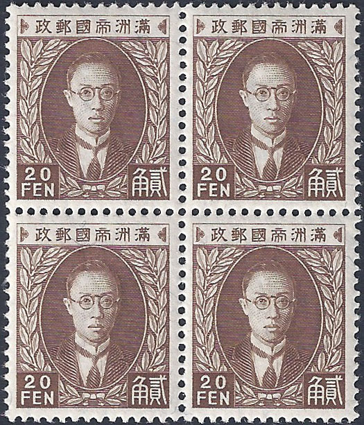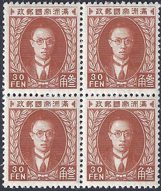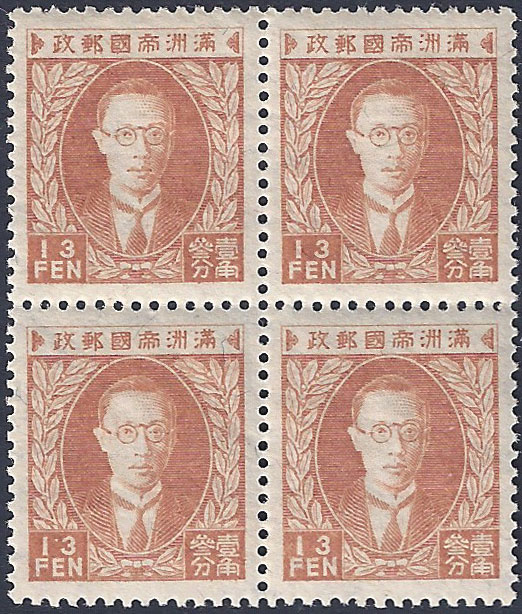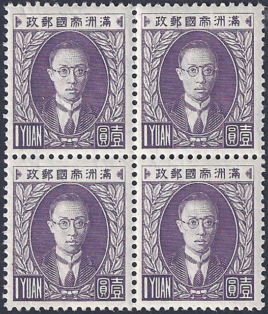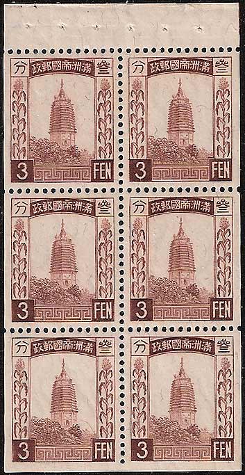 State of Manchukuo (Third Regular Issue) This set was issued from November 1934 with some values added later. Previous issues had five characters in the banner at the top reading 政郵國洲滿 " Manchu State Postal Administration" after Puyi became Emperor Kang-teh this was changed to read 政郵國帝洲滿 "Manchu State Imperial Postal Administration" the addition of a sixth character, makes this set instantly recognisable. The 5f stamp in blue was replaced with a 5f stamp in grey in July 1935, to avoid confusion with a 10f blue which was released (along with a 13f pale brown) at that time. The third regular issue underwent many reprints, with slight differences is both ink and paper, many shades are found, the most noticeable being the 1Yuan light violet. The changes in colour have led some collectors to conclude that litho printing was used for some of the later examples - but this is not thought to be the case. The stamps were recess printed on watermarked (see below) "granite" paper in sheets of 100 by the Japanese Government Printing Office in Tokyo. Designs by Mr Yutaka Yoshida. The stamps are 18.5mm x 22.5mm, Perf 13 x 13½. In addition to sheets of stamps the 1½f and 3f were also issued in booklets during December 1935, the number of these booklets to be issued was low so both booklets and booklet panes are scarce.