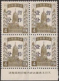 First Surcharge Issued 1st June 1934. These surcharges were applied in Harbin to stamps of First Regular Issue of 1932 due to shortages in supply of the 1f denomination, used for local (Intra City) letters and postcards. The reduction in the general postcard rate from 2f to 1½f may also have produced an increased demand. The overprint characters were written vertically and then from right to left, which is the traditional style of writing Chinese. The two characters on the right mean 暫作 temporary use, and the two characters on the left mean 壹分One fen (i.e. the new denomination of the stamp). Akagi, in his book The Postage Stamps of Manchukuo speculates that there were only three set-ups used for over-printing sheets of stamps. This he based upon small differences in the character 壹 "yi" meaning 1. He says in his book that at the time, very little data was available, and in fact his sample was too small making his widely copied diagrams meaningless. This error was not repeated in the later book written by Helen Zirkle. Imprinted postcards were also surcharged as a result of the new pricing - see the Postcards page for more information. Typographic overprinting by the Chikazawa Yoko Company in Harbin. 1f on 4f 1932 Issue (No Watermark) surcharged in black but also brown ink. |