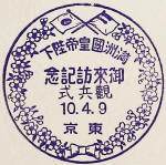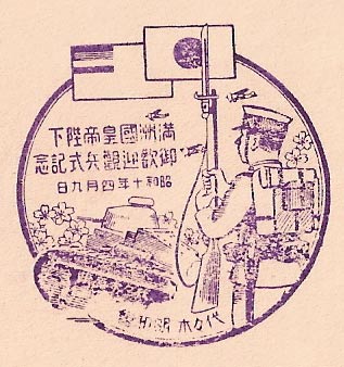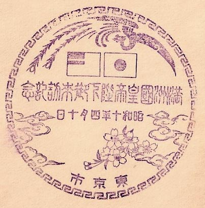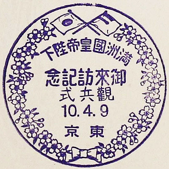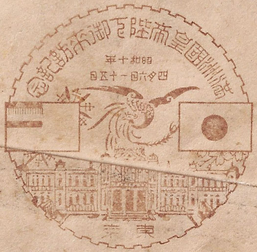 In Japan they produced a set of four stamps to celebrate the visit, together with a special cancel. The above example came from the SMRZ Post Office in Antung. The 1˝sn and 6sn Stamps show the cruiser "Hiei" and the white pagoda at Liaoyang, the 3sn and 10sn stamps depict the Akasaka Palace. Above are three Japanese Cachets issued to commemorate the visit, they have no postal validity. Cachets like this were privately produced by stamp dealers, postcard sellers and others, mostly for sale to overseas collectors. The first and second dated 9th April 1935 read "Welcoming Review of Troops Commemorating the Visit of the Emperor of Manchoukuo" and "Review of the troops commemorating the visit of the Emperor of Manchoukuo" the last three dated 10th April 1935 simply read "Commemorating the Visit of the Emperor of Manchoukuo" all come from Tokyo.