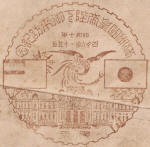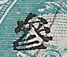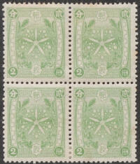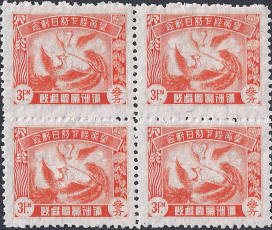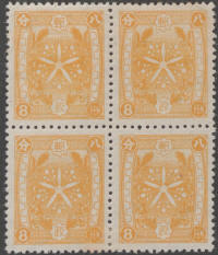 Varieties - The above block of four stamps contains each of the recognised varieties illustrated by the "Ming" character, the traditional character for the number 3 (“Ming” in this instance refers to Ming typeface, the more complicated traditional numbers were often used on documents to prevent forgery). All four types exist only in the top right hand block of four of each sheet, stamps 9, 10, 19 and 20. This block is very desirable to collectors and therefore valuable. Note: Most catalogues seem to have copied Akagi's sketch of the four "Ming" character varieties; you will see from the above that the actual characters are somewhat different. As far as I know, only the JSCA catalogue has taken the trouble to study real examples and show an accurate representation. |