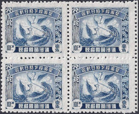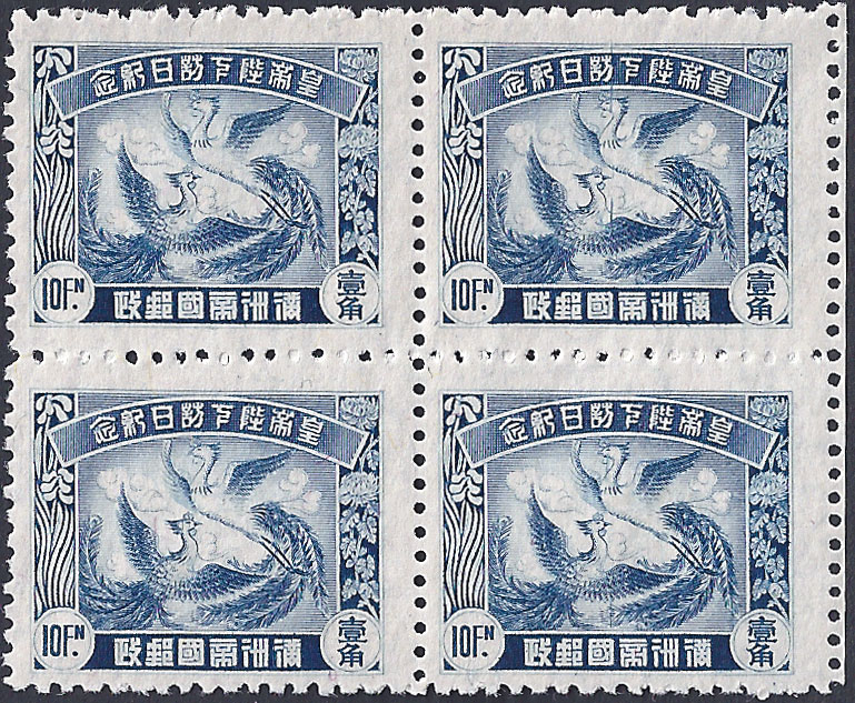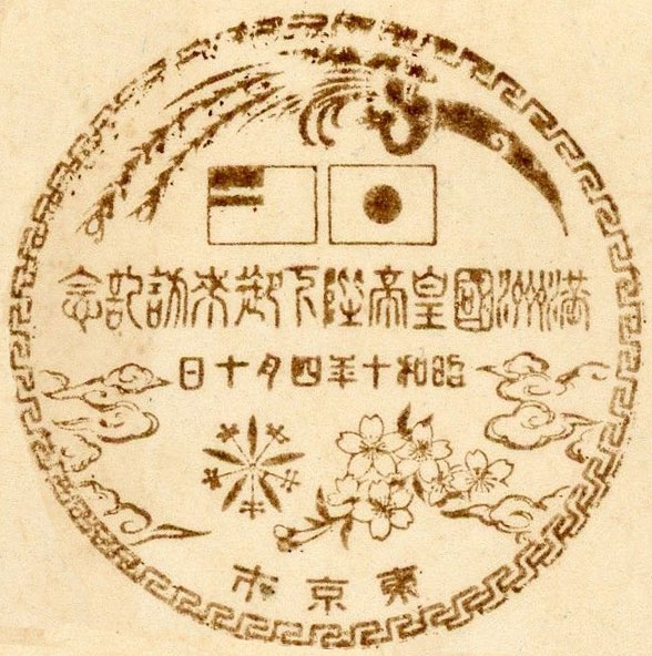 皇帝(Emperor) 陛下(His Majesty )访 (Visit) 日(Japan) Issued in recognition of the Emperors first visit to Japan. This depicts Phoenix over the sea, with the rising sun as a clear reference to Japan. The three dates of issue represent dates of the Emperor's departure, arrival in Japan and return to Manchukuo.