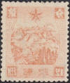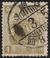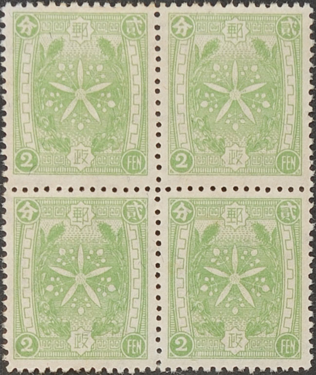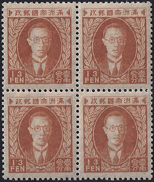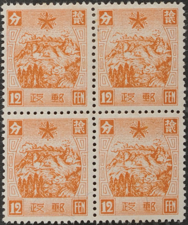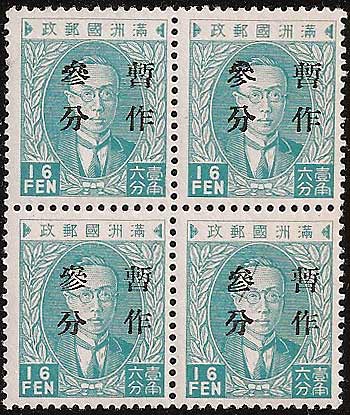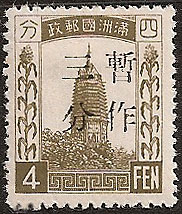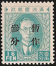 State of Manchukuo (Second Surcharge in Harbin) At the start of 1935 there was a shortage of 3f stamps which was a problem because this was the most popular denomination as it was used for domestic letter post. As a quick fix the postal authorities overprinted stocks of the first and second regular issues using denominations of which they had an oversupply. The overprint consists of 4 characters, the two on the left being the denomination 三 or 參 for three and 分 "Fen" (identical to the Chinese character for "cent"), the two on the right 暫作 meaning "temporary use". The Postal Authorities started with the 16f of the first regular issue overprinting it with 3f using the formal Chinese character for the number three. In March they repeated the process with 4f stamps from both the first and second regular issues but this time they used a simple Chinese character for the number three. The reason for this change is unknown. The number of overprints is not recorded. Typographic overprinting by the Chikazawa Yoko Company in Harbin.