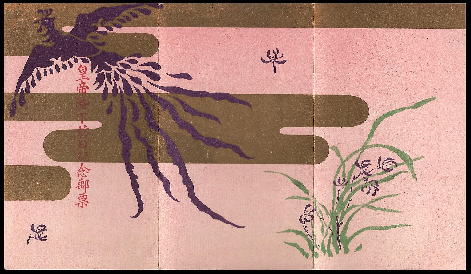 The 1˝f and 6f shown Mount Fuji in honour of the Japanese and the 3f and 10f Dancing Feng Huang (resembling the Phoenix, the male is Feng and the female is Huang, in China these are the mythical lords of all birds).