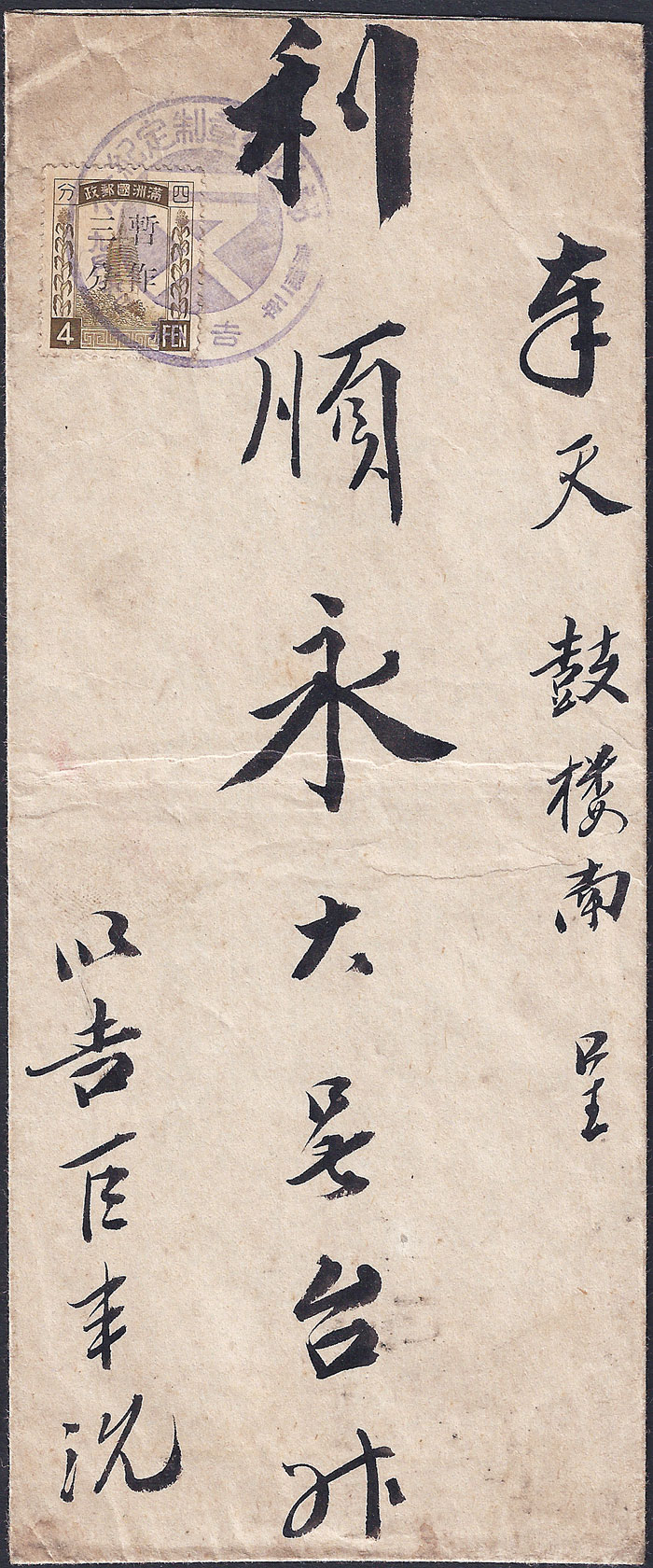 Domestic Cover Kirin to Fengtien The commemorative postmark shows that this cover entered the postal system of 18th September 1935. The stamp value is 3f and this is correct for this period. The overprint on the 4f stamp reads "3f Temporary Use" this rate was in force from 1st March 1934 until 31st March 1937, initially there was a shortage of 3f stamps.