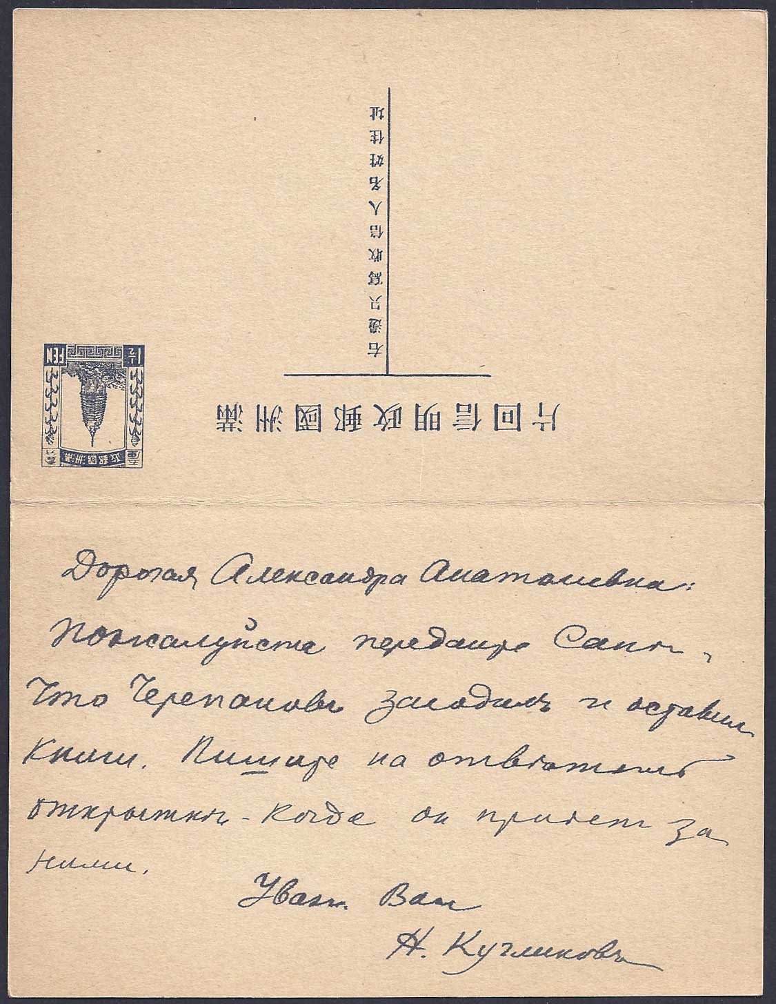 here. Alexandra Zvonnikova was the wife of a lawyer Alexandr Zvonnikov. Her family emigrated for Russia in the early 1920's and she lived in China, Brazil and Australia. In 1982 she received a card from Her Majesty Queen Elizabeth II of England to congratulate her on her 100th birthday. The card has an international postmark from Harbin and the postage rate of 1½f was the correct domestic postcard rate at this time. As the card seems to have been used within Harbin it may have been possible for the sender to have used a 1f + 1f card instead and taken advantage of the Intra-City rate. |