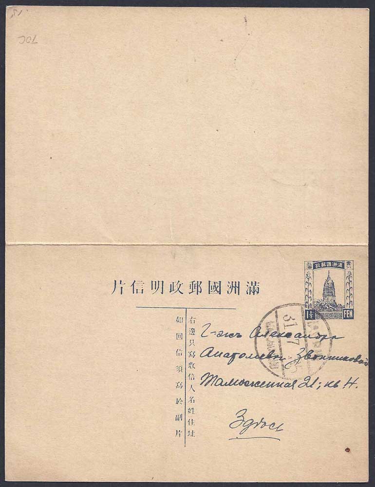 This card is purely a philatelic item and it started out at the SMRZ post office in 遼陽 Liao yang where it received the upper "scenic" cancel showing the white pagoda. This cancel uses the Japanese 昭和 Shōwa year date and was issued on 9th March 1934. Nearly a year later the card was taken to a Manchukoan post office in Mukden where the 1f stamp was added and cancelled. This lower cancel is dated 3rd March 1935, and reads 建國三周年並帝政實施周年紀念 Commemorating the Third Anniversary of the Founding of the State and the First Anniversary of the Establishment of Imperial Government. |