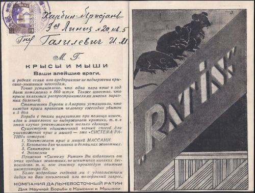 Local Commercial Postcard - Printed Matter? This is a front and back view of an advertising postcard sent by a pest control company in Harbin. Apart from the social history interest this card also raises some questions about postage rates. The card entered the postal system on 20th September 1935 and would have been a local item. A local rate postcard at this time would have required postage of 1f but this postcard only has one ½f stamp. This probably indicates that this was the local charge for printed matter and if so this rate would have been introduced from 1st march 1934, or before. Previously the earliest item of local printed matter I have found dates from 1936 so this card has caused me to revise the schedule of domestic postage rates.