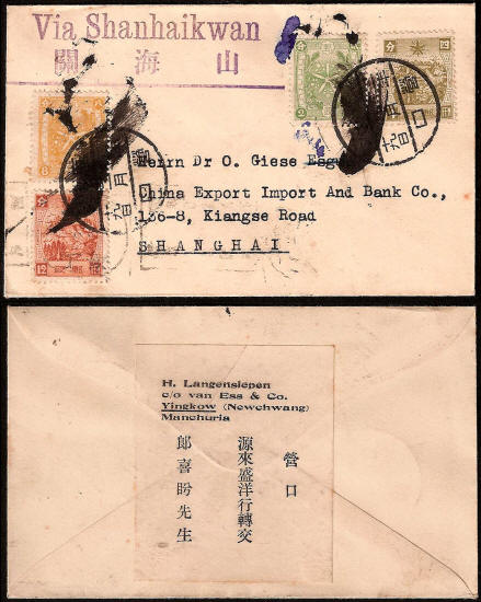 routes it might have taken. The date of posting was 19th February 1935 as shown by the date stamps. These date stamps have been defaced by black ink applied by a brush, this was because they carried the Manchukuoan year date for 1935. Could it be that the obliterators worked so poorly they resorted to ink? The cover is a philatelic item, the empty envelope is still sealed and carries one each of the first issue China Mail stamps. The correct postage for this item would have been 4f and not the 26f of stamps applied. The cover has a feint arrival postmark for Shanghai but this is unreadable. |