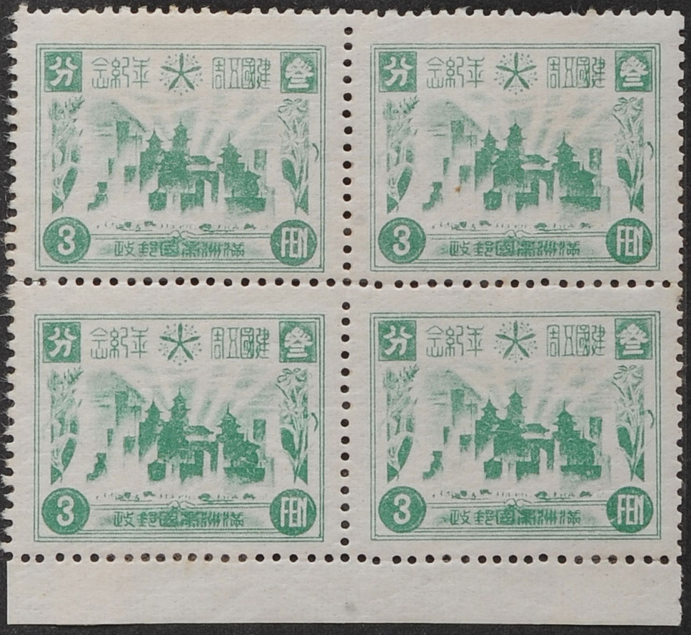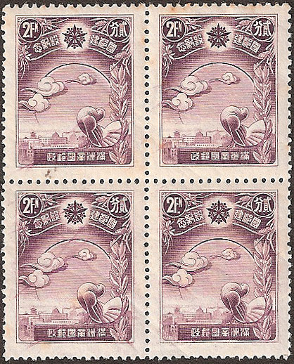 Postage Stamps Manchukuo Year 4 康德 Kāngdé Fifth Anniversary of the Founding of Manchukuo 1st March 1937, this is a commemorative issue celebrating the fifth anniversary of the founding of Manchukuo. A commemorative cancel and a special set of two picture postcards appeared for sale though Post Offices, these can be seen here. Any "specimen" stamps or sheets you may see for this issue are fakes. The stamps were lithograph printed on un-watermarked "granite" paper in sheets of 70 by the Manchukuo Government Supplies Division, Hsinking. Designs by Mr Hirozo Oya. The stamps are 21.5mm x 27.5mm and 27mm x 21.5mm. Perf 12½. 1½f, stamp. Rising Sun and stylized clouds over a ploughed Manchurian field. The majority of 1½f these stamps are thought to have come from the Post Office at Mukden. Although the print run is shown as 210,000 stamps it is rumoured that many sheets had to be destroyed due to defects, this may be one reason for the remaining supply being issued in Mukden. 3f, stamp. A shadowgraph picture with the old city of Changchun in the foreground and modern city of Hsinking in the background, to signify modernisation and progress. This stamp appears with heavy shiny gum or no gum at all. The reason for this is unclear. Offsets are known to occur of this stamp. |