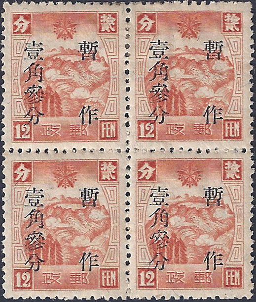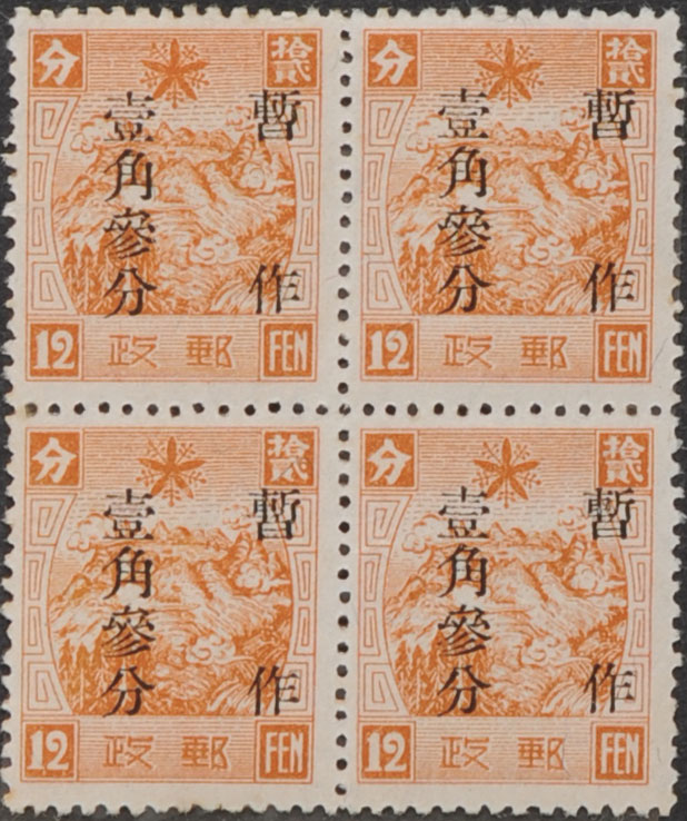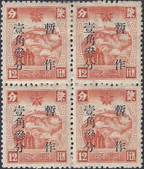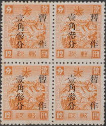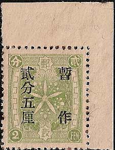 Overprint on "Open" Fen Variety. The two legs of the fen character are normally joined at the base. This occurs on stamp 10 (Top right hand corner) of each sheet of the Second China Mail Issue. Surcharges transposed and misplaced. Narrow Setting 4.5mm. Issued 12th April 1937