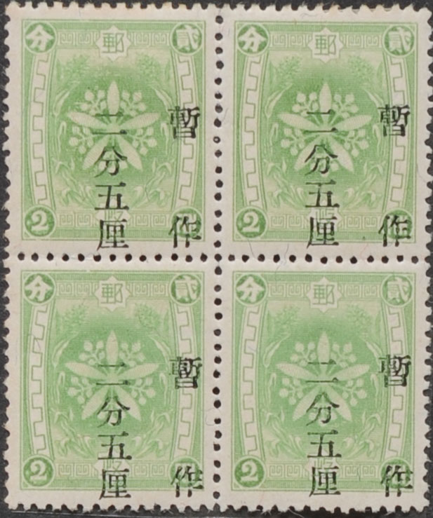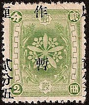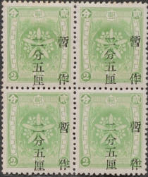 Surcharges to China Mail Issues The change in postal rates introduced on 1st April 1937 encouraged the authorities to use up all the old stock of China Mail stamps. Later in 1937 the Post Office issued new set of China Mail stamps in keeping with the new pricing. To clear existing stock they simply overprinted the new April price increase value on the stamps that remained unsold. The overprint by the Manchukuo Postal Administration Office, Hsinking, issued on 1st April 1937, consisted of four or six characters, the vertical spacing of the first batch (and most numerous) was 6.5mm but later this was changed to a narrower 4.5mm spacing. This change was made to make it easier to make sure all characters appeared on each stamp as there had been registration issues with previous print runs.