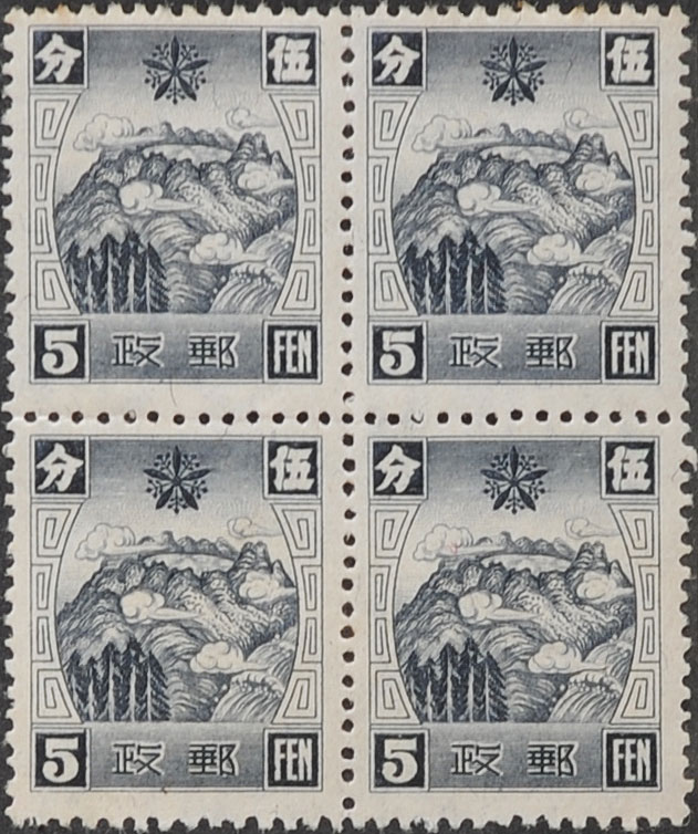 Special China Mail Stamps (Fourth Issue) Although China had accepted the use of stamps bearing the name Manchukuo, it was decided to produce a further issue of China mail stamps in line with the 1st April increases to postal prices. This gave rise to the fourth issue of China Mail stamps with new values. Many proofs are known for this issue, including a 5f in magenta. Plate flaws exist for the 13f the most common being a spots in the bottom right hand panel containing the word" FEN", these are inconsistent and should not be mistaken for a variety. Any stamps or sheets you may see for this issue marked "SPECIMEN"are fakes. The stamps are 18.5mm x 22mm, Perf 13 x 13½. Produced in April 1937. The stamps were recess printed by the Manchukuo Postal Administration Office, Hsinking.