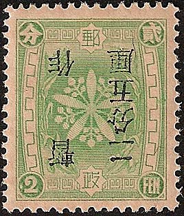 Mirror Offset - Above is a mirror offset (print on gum) error on the 5f overprint on a First Issue China Mail 4f. It is said that only one sheet of these exists, probably due to a lack of interleaving or drying when printing. |