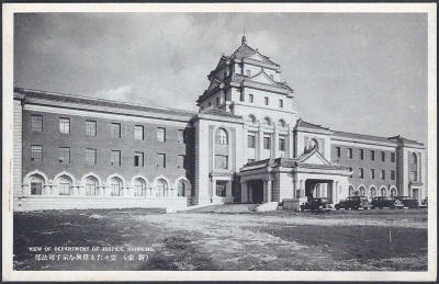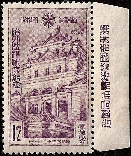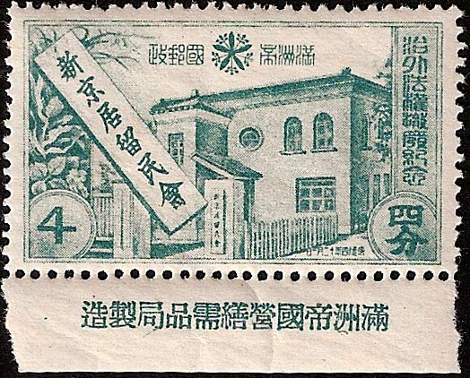 The Abolition of Extra Territorial Rights 1st December 1937. This series starting with a map of Manchukuo commemorates Japan’s relinquishment of Japanese civilian extraterritorial rights over Manchukuo. On 1st December 1937 a treaty was signed by Ambassador General Uyeda of Japan and Foreign Minister Chang of Manchukuo. This meant that control of various civil government functions such as policing, education, control of industrial production, postal services, taxation, the judicial system etc, passed from Japanese control to become the sole responsibility of the Government of Manchukuo. This included the South Manchurian Railway Zone where Japanese citizens became subject, for the first time, to the laws of Manchukuo. Needless to say, Japan retained control of all things military, and the Emperor Kāngdé. A commemorative cancel (see below) and a special set of three picture postcards appeared for sale though Post Offices, these can be seen here. This is a six stamp set litho printed on un-watermarked "granite" paper by the Manchukuo Postal Administration Office, Hsinking. Designs by Mr Hirozo Oya. This set is an odd mixture of designs, sizes, styles and perforations, so details of each are shown below by value. Note - copies of the 2f exist that are offset printed, the printing appears sharper and more legible. Department of Justice Building, Hsinking. 2f design a