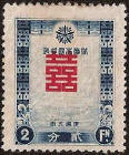Special Issue for New Years Greetings A single stamp issued on 15th December 1937 and intended for use on New Year's greetings cards featuring the character "Hsuan Hsi" Double Happiness. The post office featured a New Year promotion, all letters bearing this stamp could travel for half price between 15th and 30th December 1937, hence the 2f value, the post office ran this offer between 20th and 30th December 1936 and it was so successful that they decided to repeat it, this time with a special stamp. Special handling instructions for New Year's mail date from 1934 and details can be found here. The stamps were printed using recess printing for the blue frame and lithograph printing for the red central character. It is thought that two thicknesses of paper may exist for this issue, the thinner of which allows the central red character to show though, the thicker being more opaque. Dark sage green proofs are known to exist of the plate used to print the blue main colour. The stamps were printed on un-watermarked white paper in sheets of 100 by the Manchukuo Postal Administration Office, Hsinking. Design by Mr Hirozo Oya. This stamp is 21.5mm x 27.5mm. Perf 12 ½. 2f design