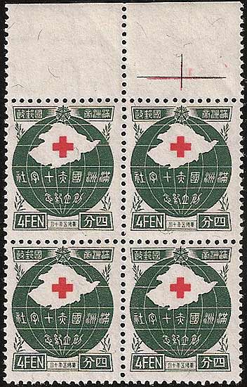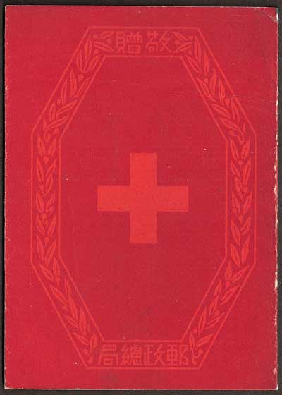 Postage Stamps Manchukuo Year 5 康德 Kāngdé The Founding of the Red Cross Society in Manchukuo 15th October 1938. This is an commemorative issue celebrating the founding of the Red Cross Society in Manchukuo. When Manchukuo was formed in 1932 medical services were provided by the Japanese Red Cross Society. From that time onward the Japanese worked to make it possible for Manchukuo to establish its own state service and the Manchukuo Red Cross Society was formed on 1st October 1938. At an inaugural ceremony on 15th October 1938 the Japanese Red Cross Society passed all of its hospitals and equipment to the new Manchukuo Red Cross Society who then continued to operate the service. This issue is interesting for three reasons, it is the first commemorative issue to be printed that is the same size as regular issue stamps, and unlike most commemoratives, the post office ordered that these stamps should be sold in place of regular issue stamps until all stocks were exhausted. These stamps were also the first commemorative issue that could be pre-ordered, a new service offered by the Manchukuo Post Office to private citizens to ensure that anyone could order in advance and collect new issues from their local branch. This set of stamps is said to have been made in a hurry and several varieties have been reported as a result of poor workmanship by the printers, this includes a reversed watermark which must have occurred because the paper was printed on the wrong side! Roy Akagi wrote about these varieties in his book The Postage Stamps of Manchoukuo and his original notes on this issue can be seen here. The stamps were lithograph printed on watermarked (see below) "granite" paper in sheets of 100 by the Manchukuo Government Supplies Division, Hsinking. Designs by Mr Takeo Yamashita. A presentation booklet exists for this issue (see below). Any "specimen" stamps or sheets you may see for this issue are fakes. The stamps are 18½mm x 22½mm. Perf 13.