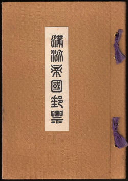 Cover and Contents of Special Presentation Booklet (Type A - see below). This was the first in a series of presentation and souvenir booklets in this format. They are made from a single sheet of folded card which, when opened, shows the stamps on the left and a description on the right. An article published in Japanese Philately "Manchukuo" Souvenir Folders by Robert H. Spalding Jn. (Vol 8, No 6 Page 122) explains that there were two versions of some folders. Type A. with the characters 敬贈 (jìngzèng) on the cover, meaning presentation or with compliments, these were used as official gifts and Type B, produced without these characters. The above is only available in Type A. The Type B folders were supplied as free gifts to customers ordering supplies of stamps by mail from the Hsinking Central Postal Services Bureau, (later known as the Manchukuo Communications Association). All of the sample commemorative cancellations reproduced in these folders show the Hsinking town name. Type B folders had the name of the issue on the front cover but not the characters 敬贈. The article goes on to add that Type B folders could also be used for presentation with the addition of a slip of paper printed with 敬贈, effectively a compliments slip. On the basis of the folders in this collection it seems that Type A is the most common.