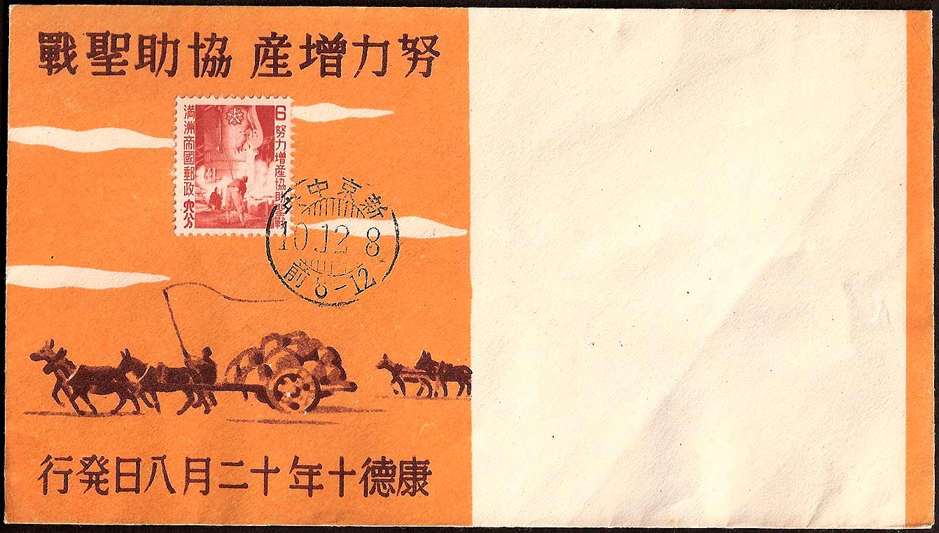 This is an official envelope issued by the Post Office of Manchukuo for use as a First Day Cover. To see the reverse side click here. The design features the spade and pick-head reflecting the emblem overprinted onto the stamps. |