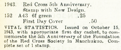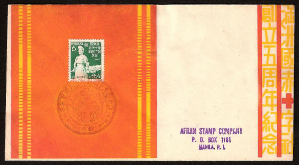 First Day Cover with Commemorative Cancel - Hsinking Post Office. (Zirkle 84) 1st October 1943. Fifth Anniversary of the establishment of the Red Cross in Manchukuo. This features orchids (the national flower of Manchukuo) and a cross, this is the emblem found on the Manchukuo Red Cross Medal. The Afran Stamp Company of Manila seem to have distributed a huge number of these covers (perhaps in co-operation with the Red Cross). It likely that these covers were sold to the many US servicemen in Manila after the war. A catalogue from the Afran Stamp Co issued in 1945 lists these covers at a price of 50c, below is an extract from the Afran Catalogue. |