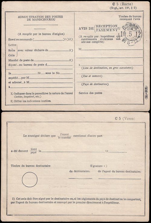 Registered Dealer Cover This cover was sent by the Russian stamp dealer F. Stroganoff to the Japanese Postage Stamps Association in Tokyo. The cover carries a "REGISTERED" hand-stamp in violet and the registration "HARBIN 705" in blue. The white label reads 日本邮便切手会员番号 Japan Postage Stamp Association Member Number containing the above address and other details. The letter was posted on 7th March 1943 and if the private hand-stamp dated 15th March is correct it will mean the transit time was 8 days. The letter carries a 15f and 3f stamp, making 18f this is the correct postage rate - letter rate 6f + 12f for registration.