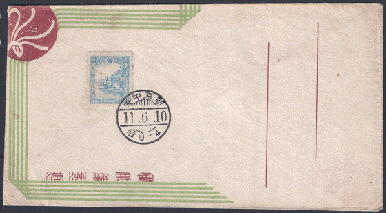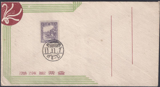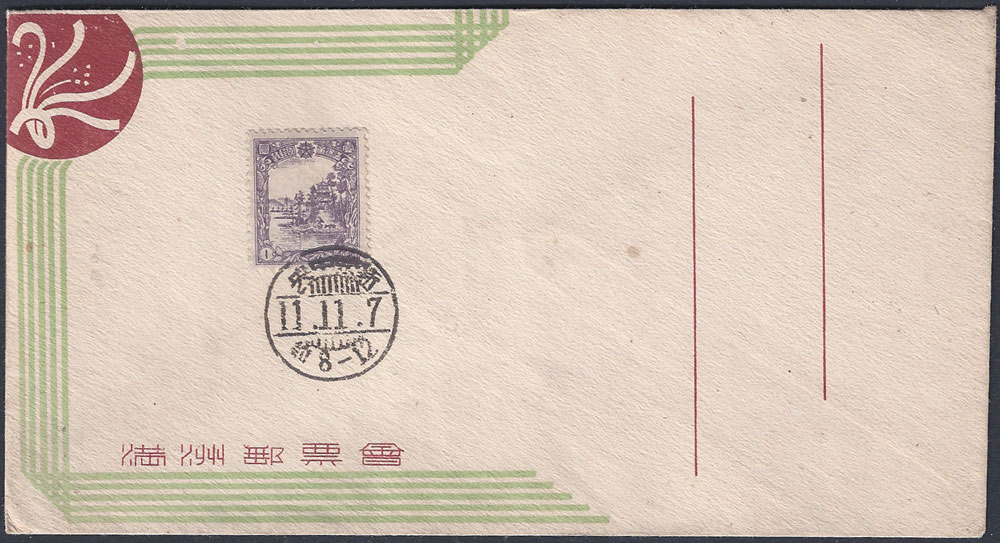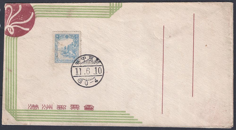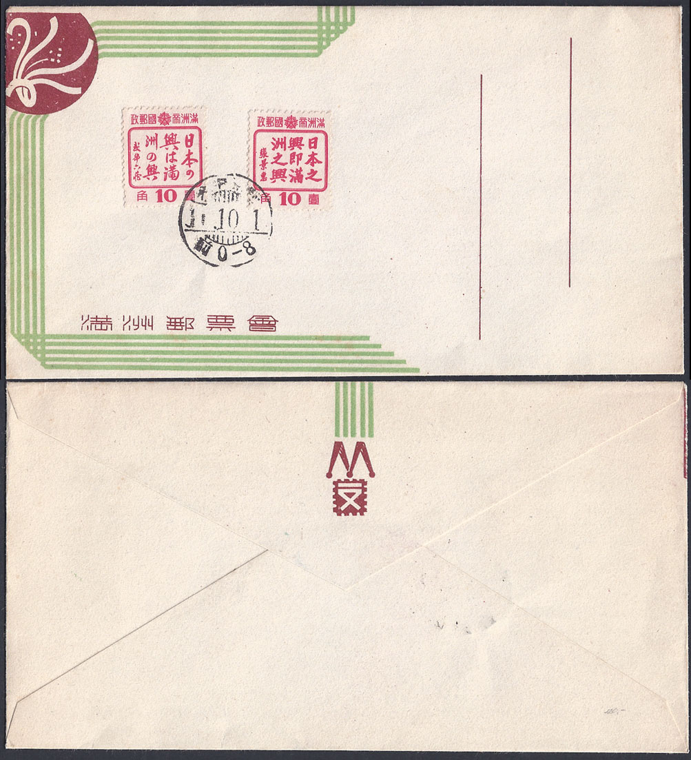 that you could not have a FDC with both stamps. The cover shown above is part of a series of covers issued from the Central Post Office at Hsinking during 1944 and 1945 and all the stamps issued between those dates could be purchased in this way. This means that a total of 10 such covers can be collected, they were aimed at the philatelic market so mailed examples are very rare. Most examples I have seen are unsealed which would have meant that postal use was possible. |