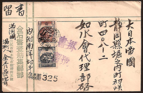 This cover was posted on 21st July 1944 in Jiamusi. It carries the violet Chinese/Japanese handstamp reading "Registered" and a registration hand-stamp reading 佳木斯 Jiamusi 中央大街 Central Avenue 325. The letter is addressed to Shizuoka in Japan. The reverse side is blank. The stamps used are 5f and 13f (China Mail) giving a total of 18f. Letter post to Japan is 6f, Registration 12f. There is no arrival postmark so the transit time is unknown. |