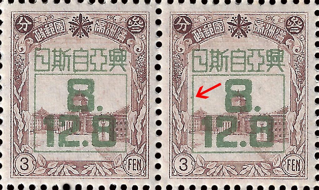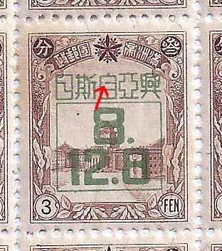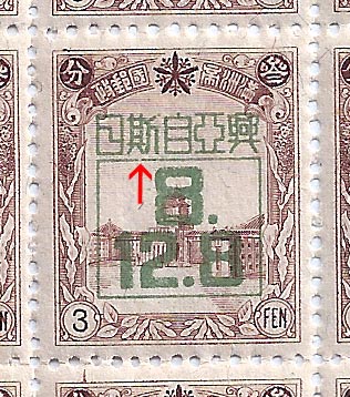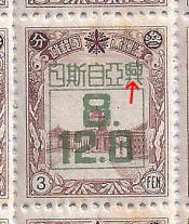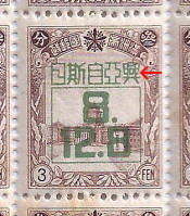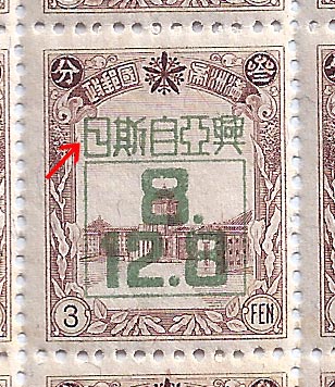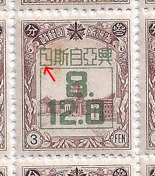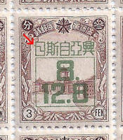 The plate varieties shown below are listed by Zirkle in her book "The Postage Stamps and Commemorative Cancellations of Manchoukuo". By looking at the different positions of the first two varieties she has made some assumptions about the number of plates used which she lists as A. B. C & D. All plate varieties appear on the 3f stamps but only A & B on the 6f, but sadly this is not that case as the 6f sheet shown below conforms to none of Mrs Zirkle's models. In fairness to Mrs Zirkle she admits to not having done the research herself, having based her information on "reports". Any shortcomings in the research is not really surprising because not many collectors will own enough full sheets for a representative sample. It is now clear that more plates exist than was first thought when Mrs Zirkle's book was written. Many of the varieties are so tiny as to delight the dedicated flyspecker, so to show you what she means by some of the tiny defects she mentions these are explored below with a red arrow pointing to the fault. You can also enlarge these images with a click of your mouse. |