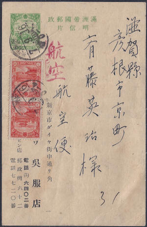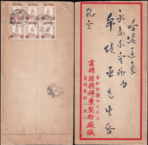 value that fits with the postage rate table. The cover was sent from Hsinking on 7th June 1944 to Tokyo in Japan. It carries a boxed 航空 "Airmail" hand-stamp and a boxed Japanese style 書留 "Registered" hand-stamp. From the registration number 新京海上ビル内 501 we can tell that it was posted from Hsinking Hai-shang Biru-nei Post Office. The red handstamp used to cross out the incorrect registration number also reads 新京海上ビル. |