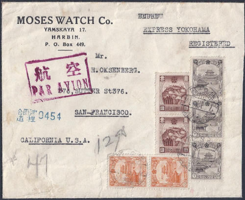 1940 Airmail Letter to the USA This is an express cover from Harbin to San Francisco via Yokohama. The cover entered the post at 哈爾濱道裡 Harbin Daoli Post Office where it was give the registration number 0451 on 11th November 1940. From there it went, probably by air to Yokohama and on by ship to the United States. On the reverse is an arrival postmark showing that it reached San Francisco on 8th December 1940. A transit time of 27 days which was not particularly quick. There was no trans-pacific airmail route at this time so airmail could only extend as far as Japan. This being so, the puzzle is to account for the 71f postage. My best guess is that it was sent Airmail to Japan = 39f + registration 16f and then either as printed matter up to 200g = 16f or as a commercial sample up to 150g = 16f from Japan to the USA. Both of these scenarios would give a total of 71f. The 27 day delivery may simply have been due the rough seas in November causing a the slow passage for the post ship..