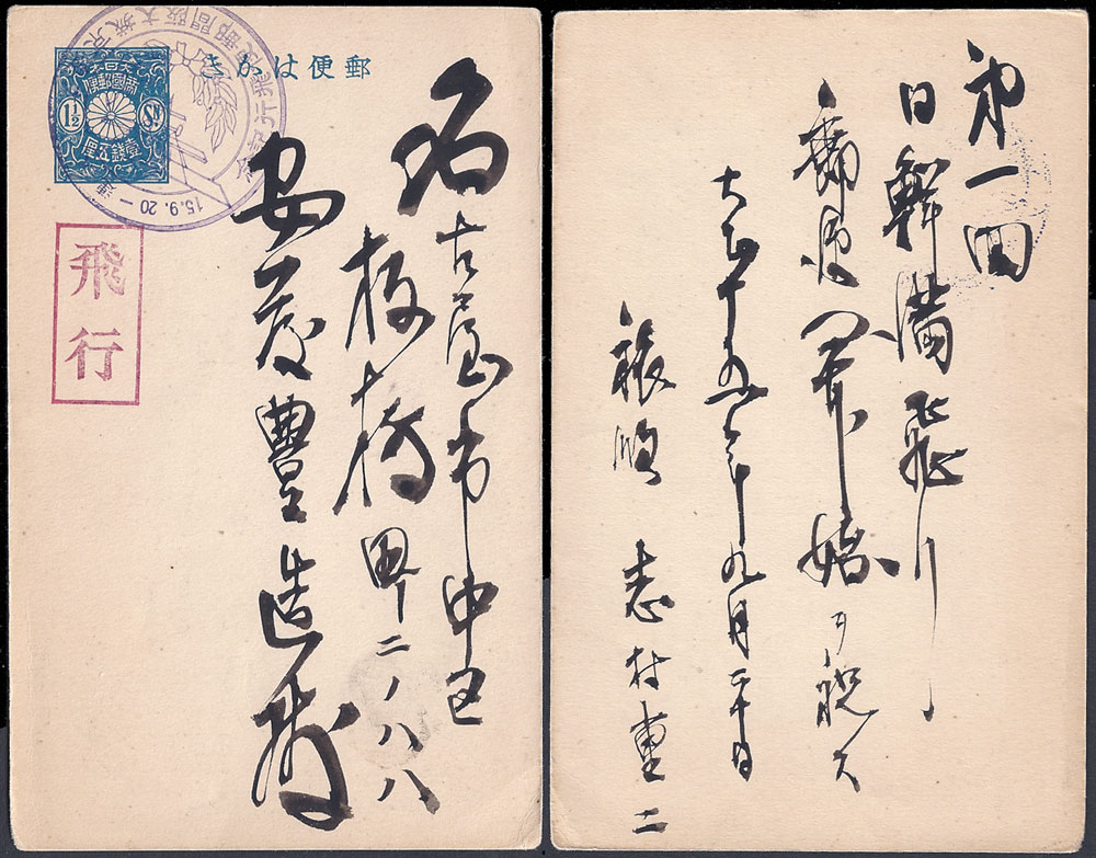 1940 Airmail Postcards to Japan These two postcard were both sent to Japan by air mail. The first on 16th September 1940 and the second 10th December 1940. The rate of 20f, made up of 2 x 9f stamps and a 10f stamp and 8f stamp added to a 2f pre-paid postcard, is correct for the period 1st April 1937 to 1st March 1942. The cards are marked 航空 indicating that the Air Mail service is required. Airmail postcards are a rarity because they are not usually used for urgent correspondence.