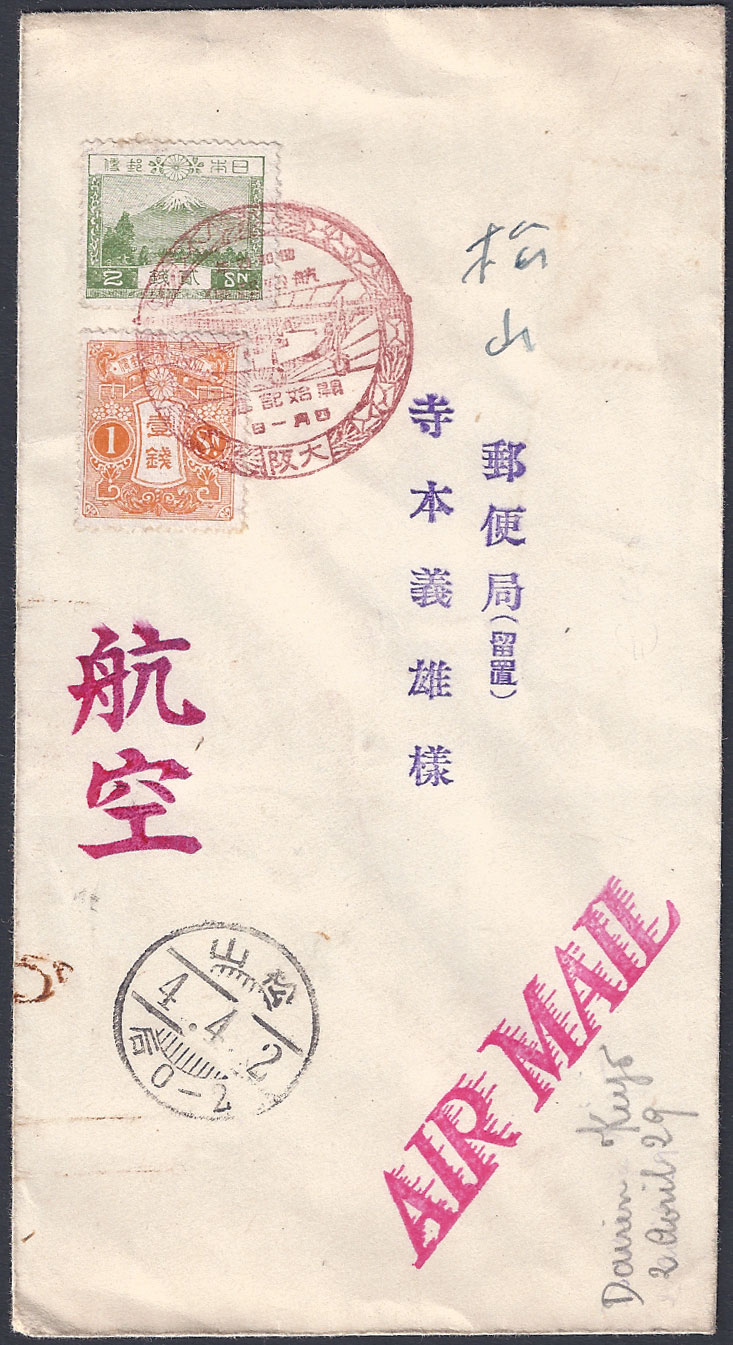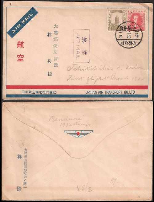 Kwantung Airmail 1929 First Flight Covers - Dairen to Japan Japan established an airmail service between Dairen and Japan on 1st April 1929 (see the covers below) and in December 1931 the Japanese are reported to have set up a regular airmail service to Japan, flying from Mukden. The Chinese complained about this unauthorised service in a Memoranda sent by the Chinese Assessor to the Commission of Enquiry established by the League of Nations. 1st April 1929 Dairen to Matsuyama, Japan. This item may have been part of a special batch of covers issued for collectors. The special cancel shows that the cover left Dairen on 1st April 1929 and the arrival cancel indicates that it reached 松山 Matsuyama on 2nd April. The postage of 3 sen was the standard domestic letter rate at this time and would have been insufficient for an airmail letter. Note - The Japanese Post Office specified that all airmail must be marked 航空 or AIR MAIL to qualify for this service, this cover demonstrates both options. 1st April 1929 Dairen to Chicago, U.S.A. This item is likely to be a privately arranged cover. The postage of 3 sen is grossly insufficient so it is likely a collector simply took it to a post office to be cancelled, while it was there the postal staff probably struck out the address in blue pencil but applied the cancels carefully and the "sender" returned home with it. 2nd April 1929 Dairen to Ōsaka, Japan. This is a special First Flight Postcard issued for collectors. The special cancel shows that the cover left Dairen on 2nd April 1929 and the arrival cancel indicates that it reached 大阪 Ōsaka on 5th April. The postcard carries 8˝ sen, this was the correct air-mail rate for a postcard on this route. The card shows the route; 1. 東京 Tōkyō, 2. 大阪 Ōsaka, 3. 堺 Sakai, 4. 高松 Takamatsu, 5. 大分Ōita, 6. 福岡 Fakuoka (Tachiarai airport), 7. 京城 Keijō (Seoul), 8. 大連 Dairen.