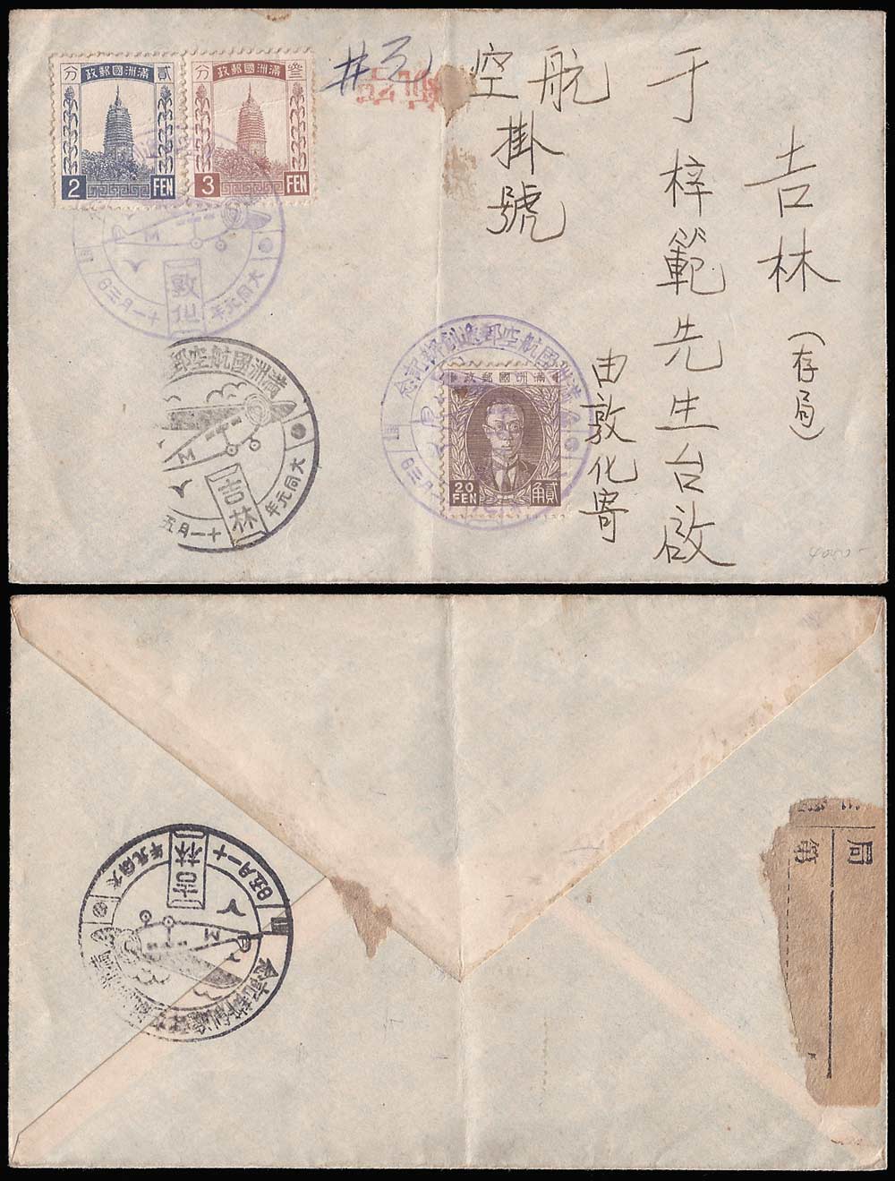 1933 Airmail Cover to Tsitsihar to Dairen 1st February 1933. This is an airmail envelope supplied by JAT. Japan Air Transport Company Limited 日本航空輸送株式会社 Nihon Kōkū Yusō Kabushiki Kaisha was the Japanese flag carrier of its day and instrumental in setting up Manchukuo Air Transport Co. The cover above is postmarked 1st February 1933, 黑龙江省 Hei Long Jiang province (Heilungkiang), 齊齊哈爾 Qiqihar (Tsitsihar) it also has a boxed Airmail hand-stamp. The stamps are both from the first general issue 4f letter rage + 15f for airmail. A pencil note on this cover seems to suggest that the first flight from Tsitsihar to Dairen took place in March 1930.