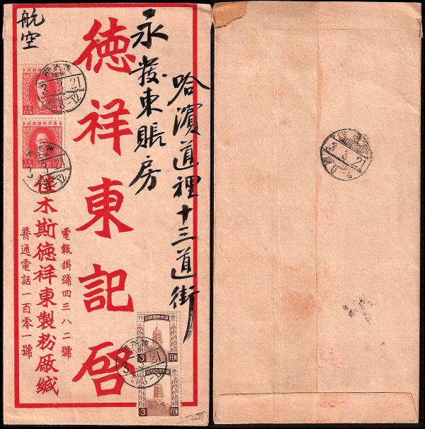 1936 Double Weight Domestic Airmail Letter This is an Airmail cover sent from a flourmill in 佳木斯 Kiamusze (Jia Mu Si) to a shop in Harbin. The letter was posted on the morning of 21st March 1936 and the arrival postmark indicates that the Harbin Post Office received it on the afternoon of the same day. The postage is correct for a double weight domestic letter, ie; over 20g. The letter rate 3f plus 15f for airmail x 2 = 36f, the value of the stamps applied. |