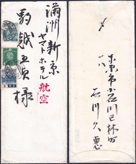 This cover was sent from the Harbin stamp dealer Stroganoff to the Japan Postage Stamp Association in Japan. Majiagou was the Jewish district in Harbin and most of the inhabitants were White Russian Jews including many who were stamp dealers. The postage date is shown as being 23rd May 1941 as can be seen by the cancel. The purple personal date-stamp of the recipient reads 28th May, as the letter was sent airmail it is likely that it reached its destination in no more than three days so the purple date-stamp is not likely to indicate the delivery date of the letter. The postage is correct, 39f for airmail and 8f for registration. The red postal marking 航空 indicates airmail, while the blue 哈爾濱馬家溝 0954 gives the registration details. The blue label (unlike the one above) is a good match for Gunter Mair's "Manchukuo Airmail Par Avion Etiquette Label Ref: MCH-A-1" as shown in his Catalogue of Airmail Labels. 1941 Incoming Airmail Cover to the Yamato Hotel, Hsinking This cover was posted on 19 February 1941 from Japan to the Yamato Hotel in Hsinking. Note that the postage is 39f which is the same price as for airmail travelling in the opposite direction.