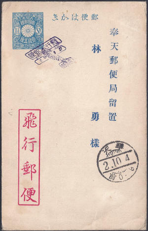 The most striking postal marking is the violet, aircraft shaped commemorative date-stamp. The lower wing indicates the date of posting and reads 2.9.27 this is 27th September 1927. The upper wing reads 飛行郵便 (Hikō Yūbin) "Airmail" (the character 行 Gyō being made up by doubling the sign "〒" emblem of the Japanese Postal Service). Lastly, the tail of the aircraft has the characters 京城 Kiejō (now Seoul) showing the originating postal town. The red boxed 飛行郵便 reads (Hikō Yūbin) "Airmail" There is also an arrival date stamp applied at the Japanese Post Office in Mukden showing that the card arrived on 2nd October 1927. A six day transit time is not quick so the flight may have encountered problems, the journey by train should not have taken more than two days. The reverse side of the card is blank