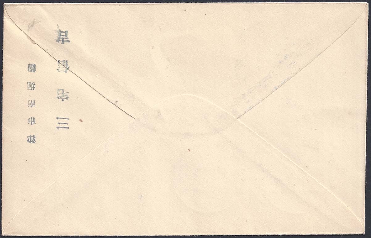 This is a first flight cover signified by the special cancel. The address 郵便局留置 means Postal Bureau Custody so it is possible that this is part of a batch of sealed covers sent for sale to collectors. The Mukden International postmarks have been carefully applied as has the M.A.T.C. label. The fact that Dairen has be written on the cover may indicate that these covers were also sent to post offices at a variety of other destinations. The reverse of the cover is shown here. The postage is correct at 18f. The city of Dairen benefitted from the Manchukuo domestic airmail rate and the above cover is proof of this. Elsewhere in the KLT the airmail rate would have been 24f at this time. |