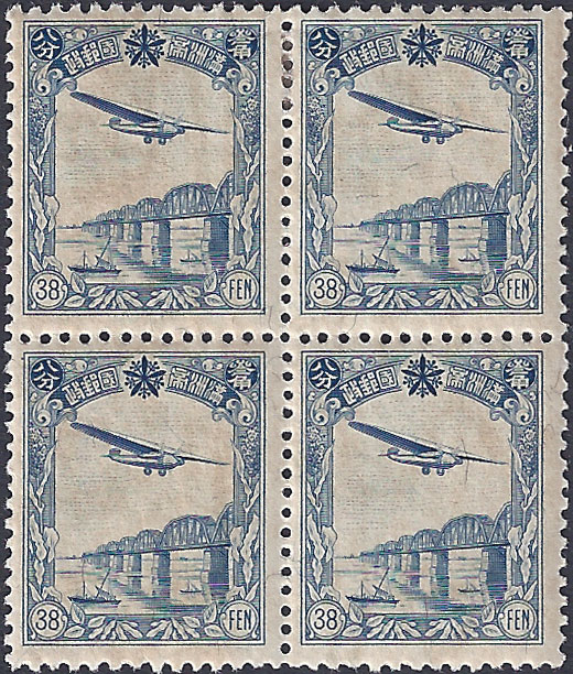 1936, 1937 and 1939 Airmail Issues This issue, based upon the Fourth Regular Issue stamps of 1936 provided the first Manchukuo stamps designed specifically for airmail use. Up to this point ordinary stamps could be used for post sent by airmail. The first two values 18f and 38f were issued on Manchukuo from 5th December 1936. In 1937 due to a price increase two new values were issued, 19f and 39f.