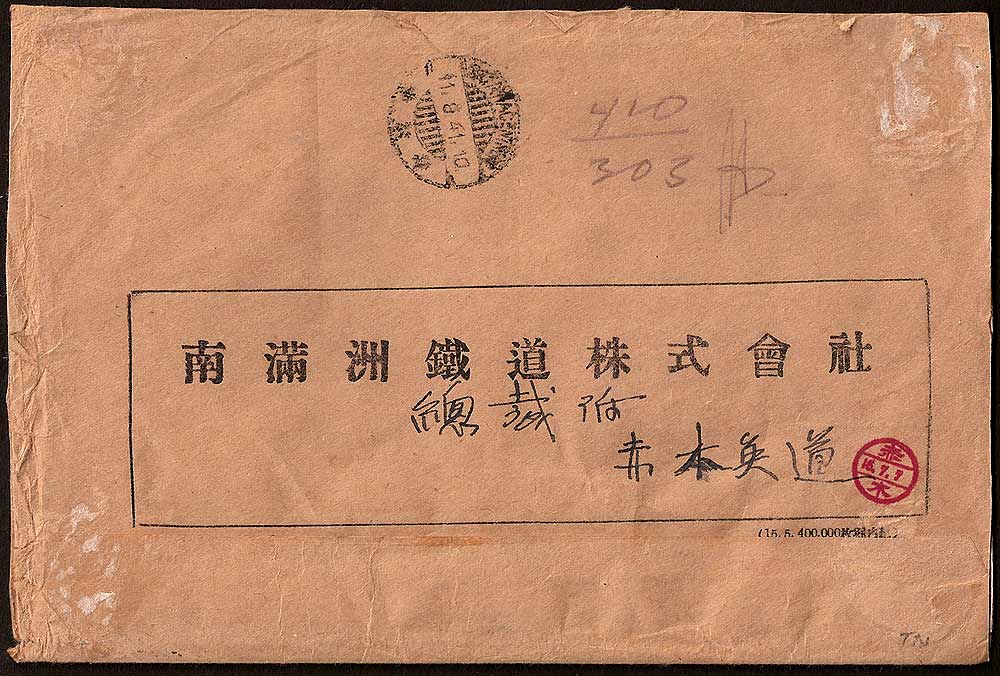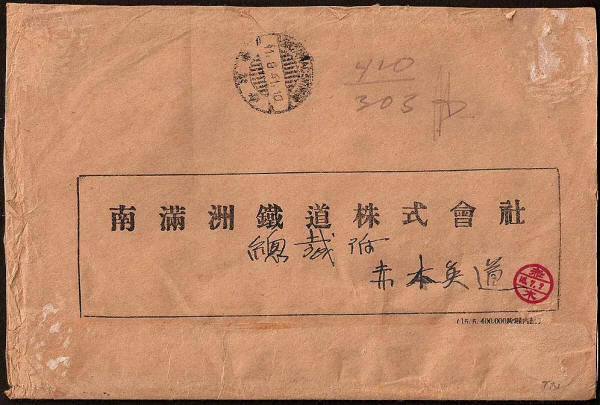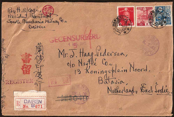 This registered item, probably containing stamps, was sent from the Post office at 大連東公園町 Higashi Park, Dairen on 8th July 1941. The recipient, Mr J. Haag-Pedersen was also a collector and writer on the subject of Manchukuo Stamps. There is a stamp to show that the item was censored in Batavia* (gecensureerd is Dutch for censored), but no arrival postmark. *Batavia was the former name of Jakarta, (the Capital City of Indonesia), it was renamed after the Japanese invasion in 1942. |