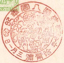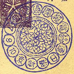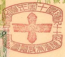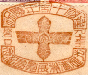This cancel is to mark the eighth anniversary of the founding of the state. The rather chaotic central area contains eight good luck signs. Size 35mm dia. Known colours - deep violet, red, green, vermillion and brownish red. |