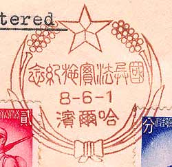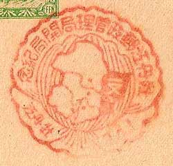The cancel commemorates the founding of the Mutanchiang Postal Services Supervisory Bureau. This new bureau supervised a total of 84 post offices and 171 postal agencies. The Mutanchiang area is shown on the map as a solid colour with the postal symbol, the other four postal areas in Manchukuo are shown on the map and marked by a dot. Size 35mm dia. Known colours - deep violet, red, blue and reddish brown. |