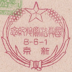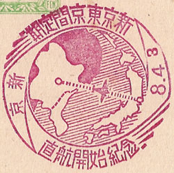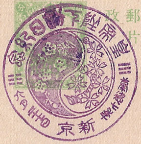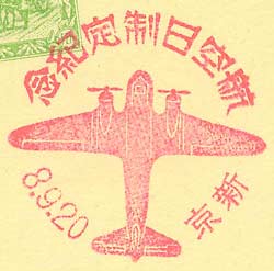 1941. 新京東京間定期直航開始紀念 reads Commemorating the Inauguration of Scheduled Airline Service between Hsinking and Tokyo. This cancel celebrates the opening of a regular air passenger service between the two capitals, 新京 Hsinking and Tokyo. The cancel makes it appear that this was a non-stop service but in fact refuelling stops were made at Yonago in Japan (Tottori Prefecture) and Ch'ongjin in Korea The day date number is changeable and can also read 4th or 5th. Size 35mm dia. Known colours - red, violet and reddish brown. |