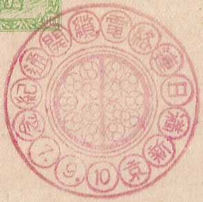 1940. 満日連絡電纜開通紀念 reads Commemorating the Completion of the Telegraph Cable between Manchoukuo and Japan. The design of this cancellation represents the cross section of a telegraph cable. Issued on the date of the commissioning of the first cable to directly connect 新京 Hsinking with Tokyo. Size 35mm dia. Known colours - red, reddish brown, blue and light blue. The light blue version shown above is a later strike and cannot be considered a legitimate usage. |