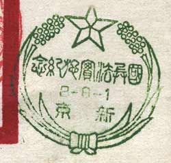 1941. 國兵法實施紀念 reads Military Selective Service Policy Implementation Commemoration. This cancel was issued to help to publicise the National Conscription Law, it shows the Manchukuo Army Star and sheaves of Kaoling.. Size 35mm x 35mm to star tip. Known colours - deep violet, red, blue, blue grey, green and reddish brown. The green shown above is a later strike and cannot be considered a legitimate usage. |