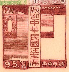 - Issued 8th May 1942. 歓迎中華民國汪主席 reads Welcome President Wang of the Republic of China. This cancel is to welcome President Wang Ching-wei, like Pu-yi, President Wang was the head of another puppet government based in Nanking. He visited Darien in the KLT and then went on to spend three days in 新京 Hsinking. The flags of both regimes feature in the design which is "unnaturally imbalanced" due to the pennant on the top of the Chinese flag. The Chinese referred to the pennant as a "pig's tail" and Wang received a lot of criticism over it. Size 37mm x 32mm. Known colours - reddish brown only. |