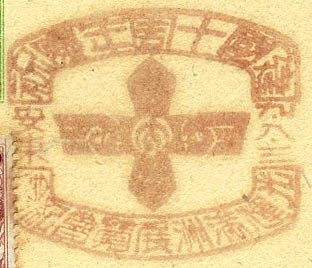 建國十周年慶祝東亜教育大會紀念 reads Commemorating the Tenth Anniversary of the Founding of the State - Celebrating the East Asia Education Congress. East Asian Education Congress Cancel. Four main characters read "100 Years to make a man". Zirkle only lists the 22nd July, however the example above reads 24th, so maybe the congress lasted longer than originally thought or the cancel was available for a few days afterwards. Cancels reading 22nd are most common - I have not seen a version reading 23rd. Size 36mm dia. Known colours - red and reddish brown. |