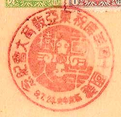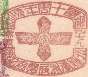 28th June 1940. 皇帝陛下訪日紀念 reads Commemorating the Emperor’s Visit to Japan. The text explains that the stamps are to commemorate the second visit of the Emperor Kang-Teh to Japan in both Chinese (top) and Japanese (bottom) characters. The cancel also features the national flowers, apricot and cherry. Not a very successful cancel in that it often appears blurry and indistinct. Good copies are hard to find, possibly due to the reddish brown ink which is most commonly used and was probably issued with the chop. This cancel has a changeable date, the right hand Chinese day date figure can read 26th (above), 27th or 28th. Size 36mm dia. Known colours - deep violet, red, and reddish brown (above). |