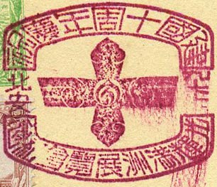 - 28th May 1942. 奉迎御差遣宮殿下 reads Welcome His Imperial Highness the Japanese Imperial Messenger. Issued welcome the Imperial Prince Takamatsu (brother of the Emperor Hirohito) on a visit to Manchukuo. This visit was connected with the 10th Anniversary Celebrations and lasted eight days during which time Prince Takamatsu travelled from Dairen to 新京 Hsinking. The date of this cancel is 28th May 1942, the day on which he was welcomed by the Emperor Kang-Teh at his palace in 新京 Hsinking. Zirkle only mentions 28th May in connection with this cancel but a version also exists from Mukden Central P.O. dated 1st June, two days before the Prince's departure on 3rd June. Size 45mm x 34mm . Known colours - red and reddish brown. |