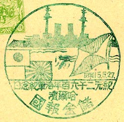 Shōwa date) The ship pictured is Admiral Togo's flagship Mikasa (built in the UK). The flag is Togo's "Z Flag" as flown at Pearl Harbour. The date May 27 is the anniversary of Togo's victory over the Russians in the Battle of Tsushima. The text reads 2600th year Naval Commemoration Day or simply "Navy Day"- Harbin, and below that "chokin hokoku - Savings - Patriotism". This cancel is mentioned by John V Sweet as being legitimately used by the Post Office in Harbin. (See China Clipper Vol IV, Issue 6, page 84). This cancel is a clear indication that a Japanese Postal Agency existed in Harbin after the Abolition of Extra-territorial Rights in December 1937. It is certain a Manchukuoan Post Office would not have used a 昭和 Shōwa year date. Size 42mm diameter. Known colours - green. |
