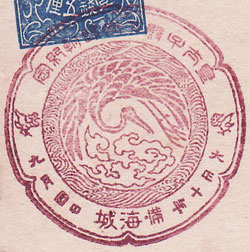 Available in China only from Dairen Central PO, Mukden Central PO, Hsinking Central PO and Yingkow. Size 35mm dia. Known colours - red. |